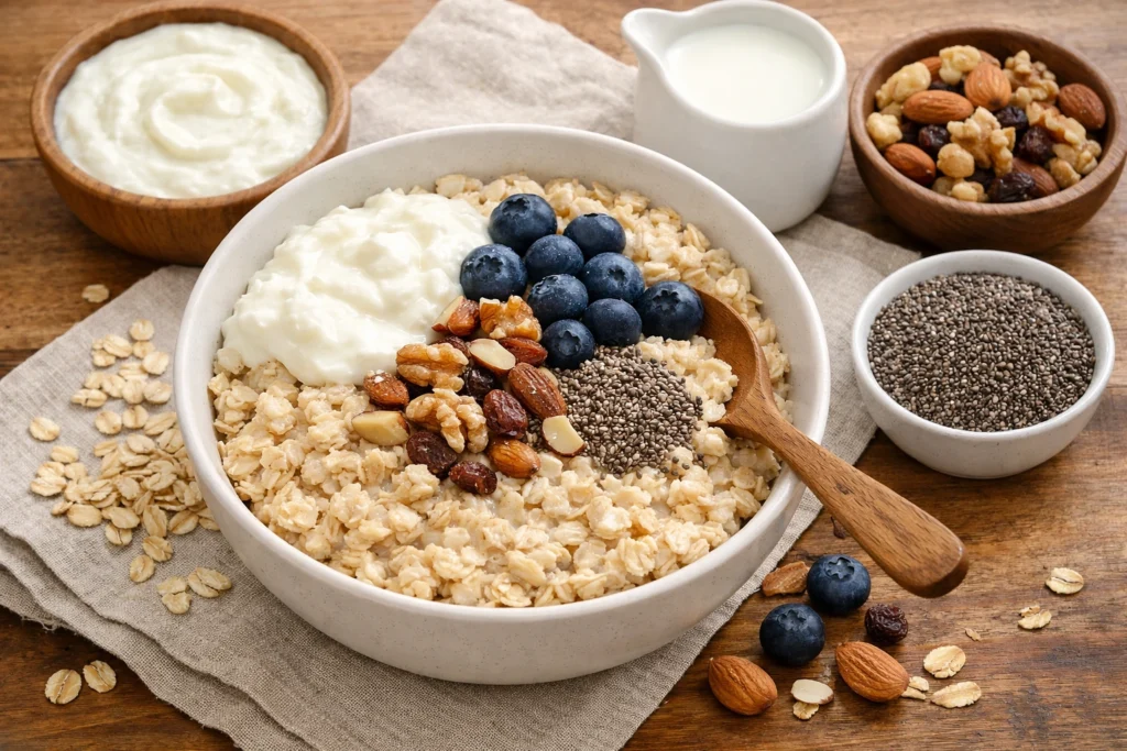 Early on, I made the mistake of thinking that eating oats alone was enough. What I slowly understood is that the way oats are paired with protein, fibre, and healthy fats makes a big difference in how filling and satisfying they feel.